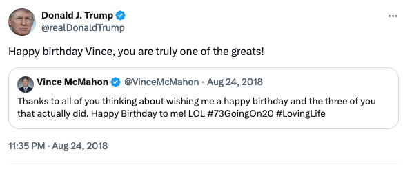 I probably wouldn’t have heard about the McMahon imbroglio either if it weren’t for my friend Tom Scocca’s recent interview with Tim Marchman in his newsletter. They note the extensive ties between Trump and McMahon, which go well beyond a formative 2007 storyline in which the two ended up co-headlining that year’s WrestleMania — an event that both helped re-popularize Trump to his future base, and, many have noted, gave Trump a blueprint for his violence-soaked psuedo-populist rallies.