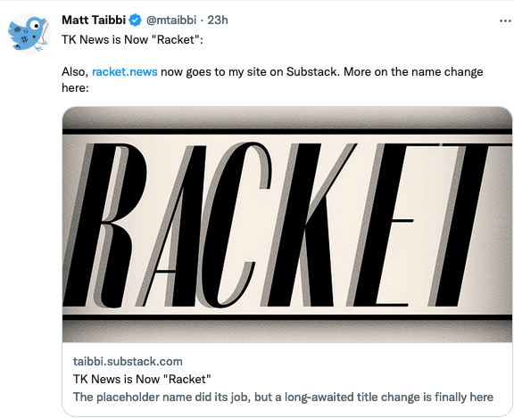 Note: In 2005, journalist Matt Taibbi hastened the bankruptcy of his then-employer, the New York Press, by publishing a column titled “The 52 Funniest Things About the Upcoming Death of the Pope.” In that vein, I present the funniest things about a much older, much more reactionary Taibbi changing his newsletter’s name and web address to — you read that right — Racket.